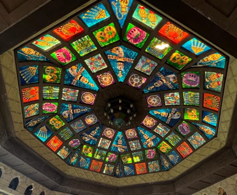 La Gran Mezquita del Sultán Qaboos, en Mascate, obra maestra arquitectónica del arte islámico moderno, fue construida con piedra arenisca y mármol policromado. En la sala de oración principal bajo la inmensa cúpula destaca una hermosa lampara araña de cristal Swarovski y una alfombra persa artesanal de dimensiones gigantescas.