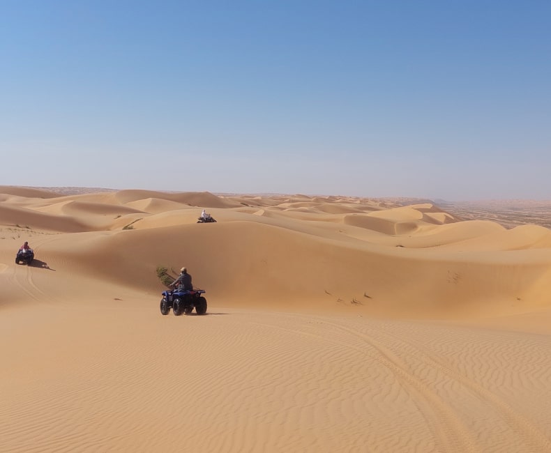 En el desierto de “Wahiba Sands” a lo largo de la costa oriental se disfruta del turismo de aventura con los paseos en camello, o tomando un vehículo 4x4 y desafiar el mar de dunas para terminar al atardecer en un campamento al estilo beduino pero equipado con todas las comodidades. Además, los beduinos de la zona reciben en sus jaimas a los viajeros y permiten conocer su ancestral cultura.